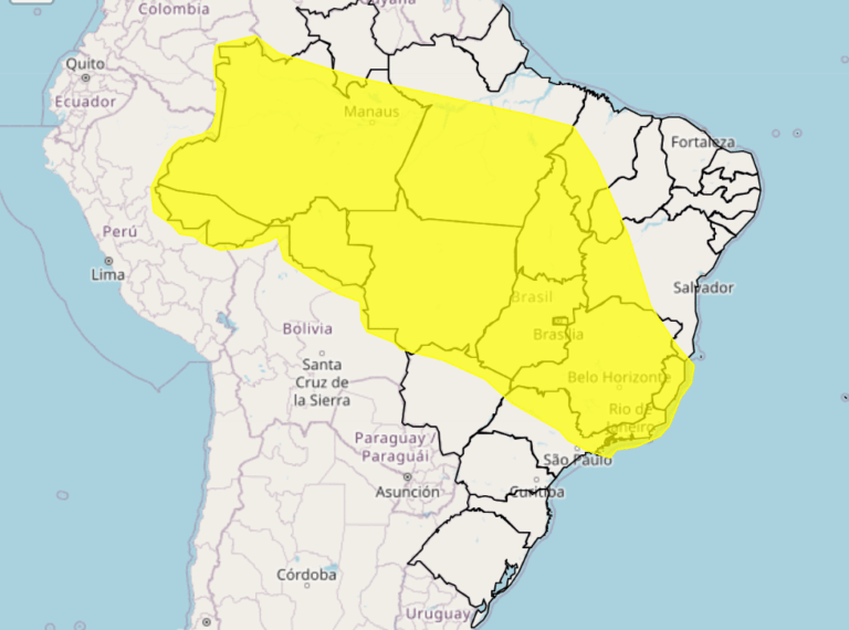 Segundo o Inmet, o sistema favorece acumulados elevados em áreas do Amazonas, Mato Grosso, Goiás, Minas Gerais e Rio de Janeiro. Há alertas de grande perigo, em vigência até quarta, 17, para tempestades e chuvas intensas em várias regiões.
