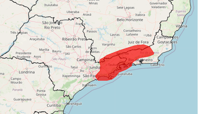 Há indicação de tempestades no Vale do Paraíba, Serra do Mar, Mantiqueira, sul de Minas, Triângulo Mineiro e em grande parte do território fluminense. Nesses locais, os volumes podem variar entre 100 e 200 milímetros em 48 horas. São Paulo e Espírito Santo devem registrar pancadas isoladas, com menores acumulados.