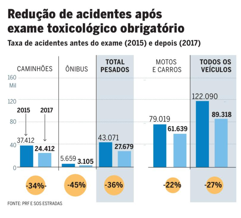 Embora a exigência seja nova para carros e motos, motoristas profissionais já passam pelo exame desde março de O resultado, segundo levantamento do SOS Estradas, foi expressivo: entre 2016 e 2019, houve redução de 60% no uso de drogas entre condutores de caminhões, ônibus e carretas em fiscalizações de rotina. O exame toxicológico é considerado um dos instrumentos mais rigorosos de detecção de drogas no país e já é aplicado desde 2016 para as categorias C, D e E. Diferentemente de testes de sangue ou urina, utiliza a chamada larga janela de detecção, capaz de identificar o consumo de substâncias psicoativas em até 90 dias antes da coleta.