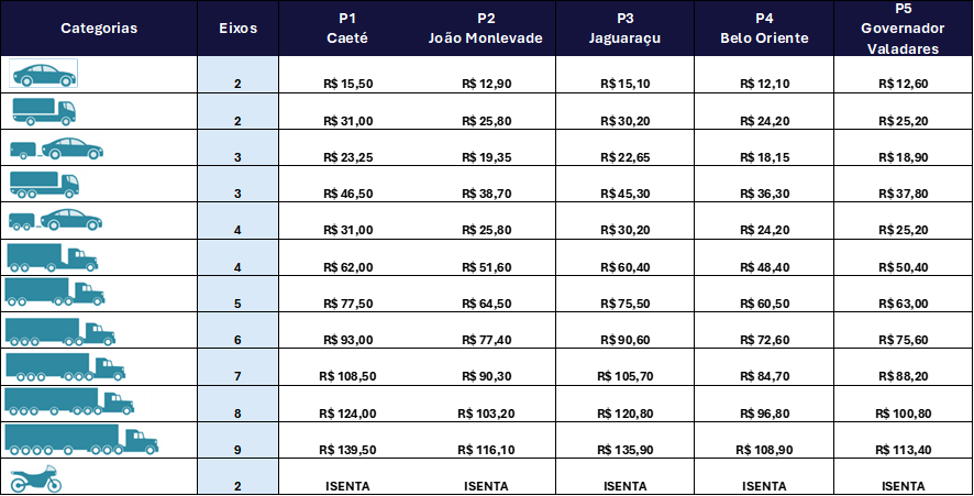 Para veículos de passeio, a tarifa em Jaguaraçu será de R$ 15,10; em Belo Oriente, de R$ 12,10 e, em Governador Valadares, de R$ 12,60. Em Caeté e João Monlevale, a tarifa já praticada é de R$ 15,50 e R$ 12,90, respectivamente (confira abaixo a tabela completa).