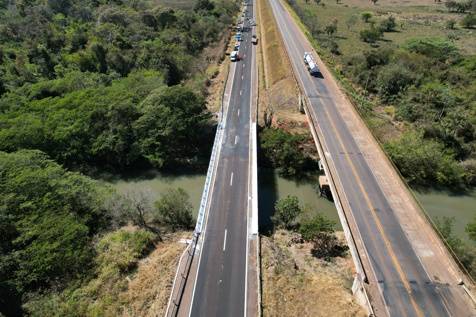 A manhã do último sábado (9/8) marcou uma mudança importante para quem trafega entre Goiânia e Rio Verde (GO). A pista no sentido sul da ponte sobre o Rio Capivari, no km 267,1 da BR-060, foi totalmente liberada ao tráfego, encerrando um desvio que, desde fevereiro, limitava a passagem de veículos no local. A iniciativa devolve mais segurança, fluidez e conforto aos motoristas. A entrega é o primeiro resultado prático de um pacote de investimentos de quase R$ 7 bilhões que vai transformar a infraestrutura rodoviária do estado.