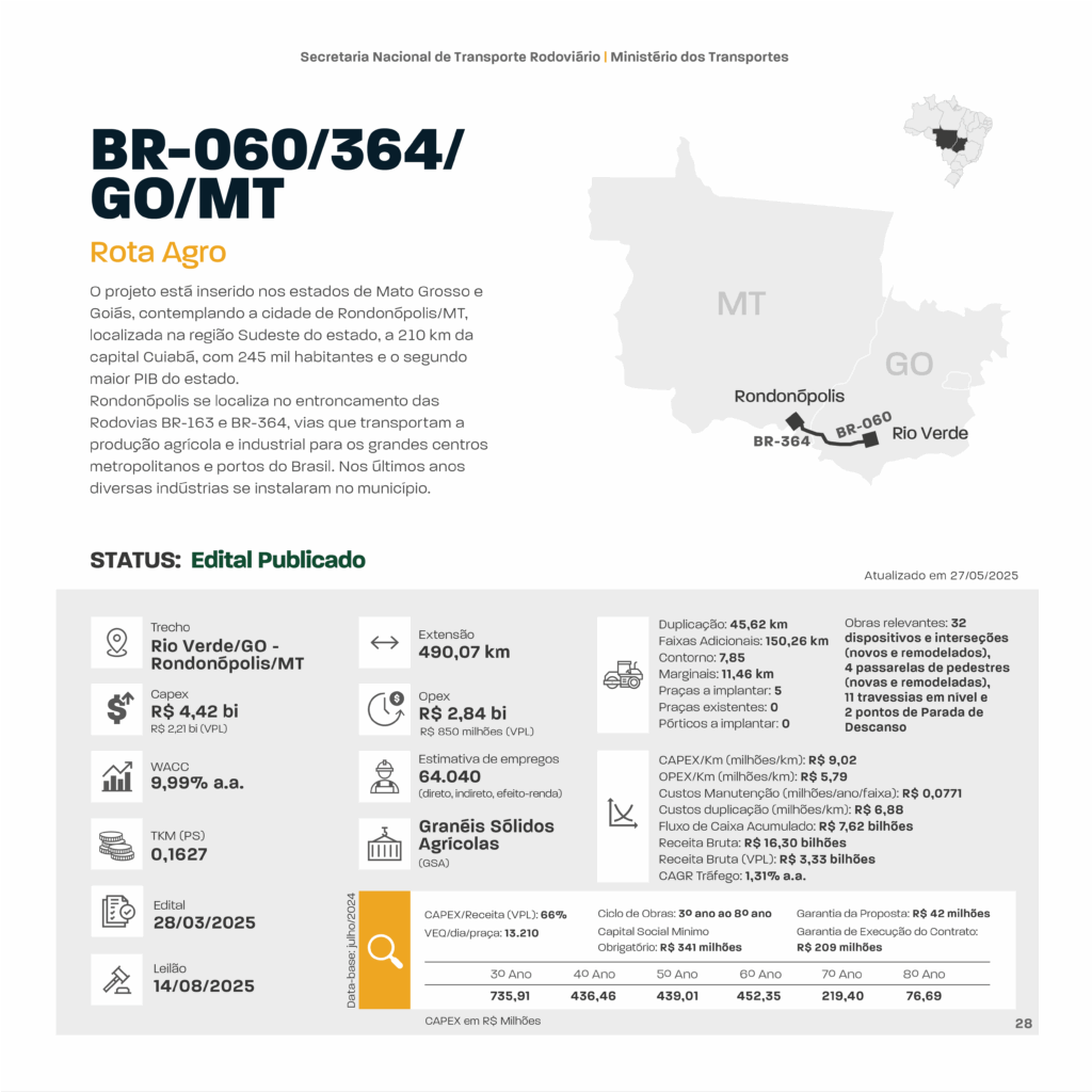 No próximo dia 14 de agosto, a Agência Nacional de Transportes Terrestres (ANTT), em parceria com o Ministério dos Transportes, realizará o leilão da Rota Agro. Trata-se de um projeto estratégico voltado à concessão de serviço público, precedido pela execução de obras de infraestrutura. A iniciativa abrange trechos das rodovias BR-060/364/GO/MT, totalizando 490,065 quilômetros, com foco na recuperação, manutenção, conservação, operação, implantação de melhorias e ampliação da capacidade viária. O trajeto vai do entroncamento com o contorno de Rio Verde (GO) até a entrada da BR-163, em Rondonópolis (MT), passando por municípios como Jataí, Santa Rita do Araguaia e Alto Araguaia. O objetivo é fortalecer a logística regional, promovendo mais segurança e eficiência no transporte rodoviário, especialmente para o escoamento da produção agropecuária — um dos pilares da economia brasileira.
